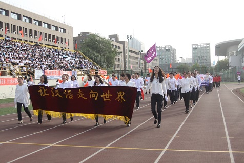 (通讯员 岳琨)金秋时节,来自太阳成集团tyc151cc的五十余名职工新生满怀热情地参加了2017年太阳成集团tyc151cc官网全校运动会。他们身着院衫,挥舞院旗,手举“学汉语到南开”的标语,高喊“推广汉语,振兴南开”的口号,精神饱满,兴高采烈参加了校运动会的入场式,独具特色的队伍得到了主席台和观众席上的校领导及师生观众的热情欢迎,会场气氛达到高潮。