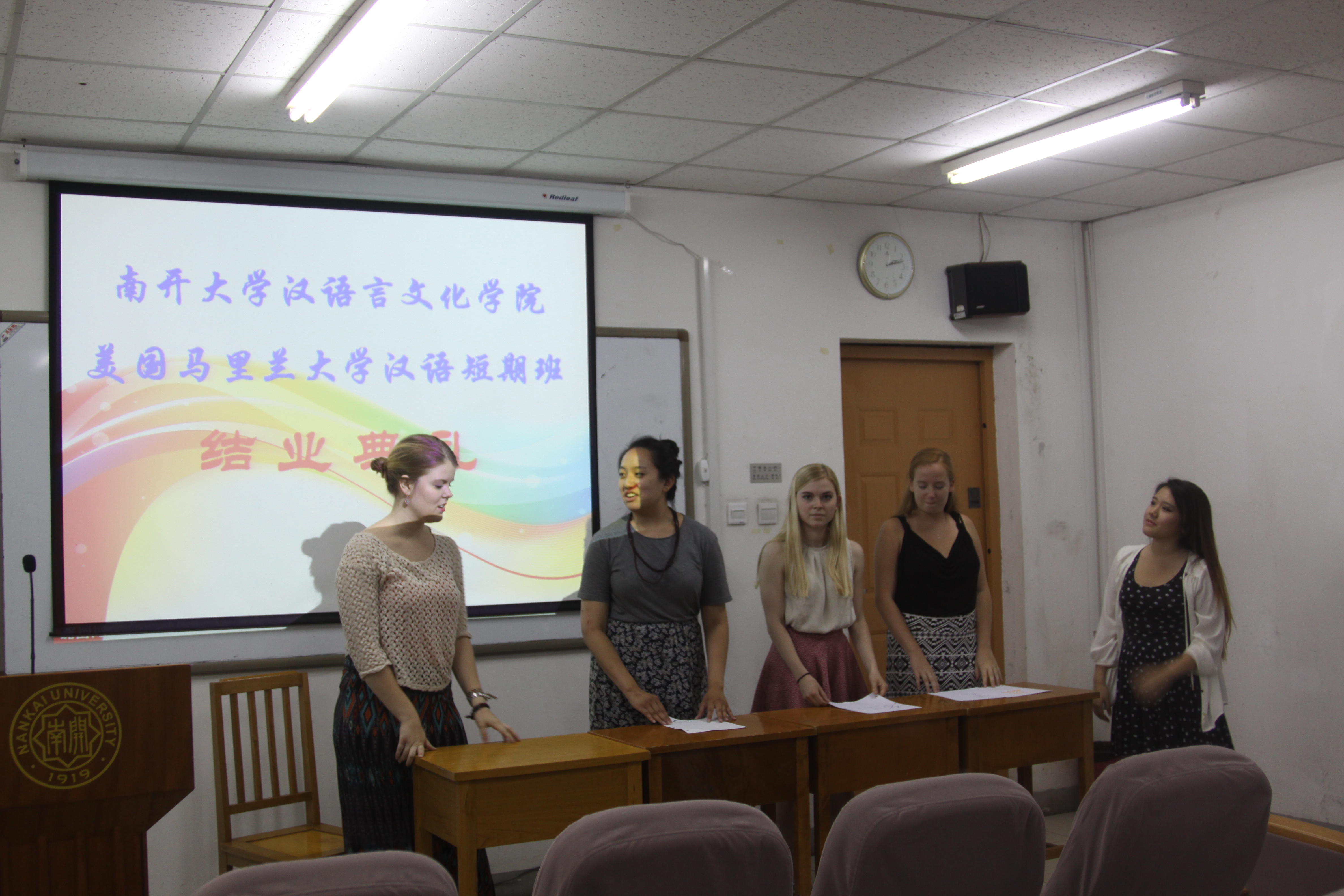最后,冉启斌为全体职工颁发结业证书,全体师生一同合影留念,2015年马里兰大学汉语短期班圆满落下帷幕。