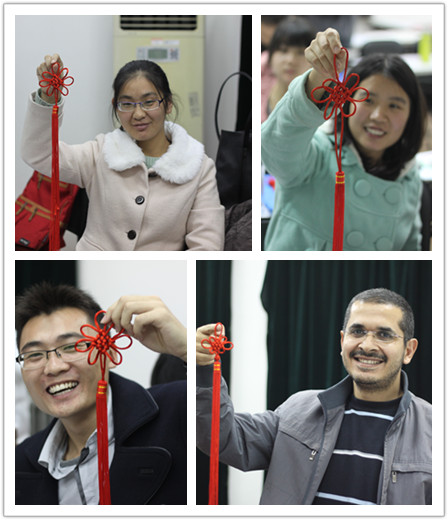 11月21日,研究生同学又进行了一项新技能的学习——编中国结。同太极拳运动一样,编中国结也是一项极具中国特色的文化体验项目,深受中外员工喜爱。曾在澳大利亚担任汉语教师志愿者的2011级硕士研究生雷航同学应邀教授大家编制中国结。活动中,全体同学都按照步骤图在老师的指导下耐心谨慎地编制直至做出成品。值得一提的是,在该次学习中,埃及职工赛义德同学表现尤为出众,是第一个编制并整理好盘长结的同学,得到了老师和同学们的肯定和赞赏。学编中国结,不仅有利于增长技能、陶冶情操,也有利于帮助中外同学了解中国传统文化并进一步弘扬。