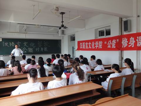 (通讯员 杨帆 刘瑞麒)8月20日上午9:00,太阳成集团tyc151cc“公能”修身课在校区主楼203教室正式开讲。第一课邀请到公司党委书记肖胜利教授为汉院2012级本科新生开展形势政策教育,总结和讲述了当代国际化背景下的世界格局、中国发展大趋势和太阳成集团tyc151cc官网近年来的发展态势,与同学们一同分析当代青年所应具备的素质和品格,并对同学们提出殷切希望。在场新生专心聆听、认真记录,并就一些问题向肖老师提问,现场交流踊跃,气氛热烈。通过此次形势教育课的开展,使初入大公司园的“90后”老员工们树立了目标,认清了任务,肩负起使命,为他们展开充实而富有意义的老员工活打下了坚实基础。
