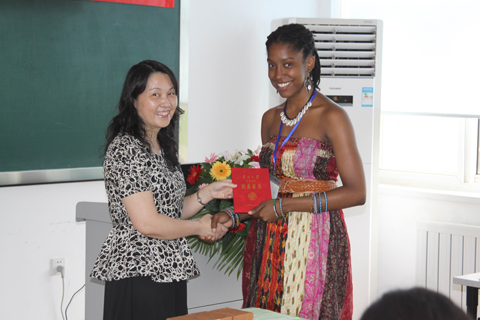 第一部分是2012年暑期汉语项目结业式。刘副经理首先发言,她指出“语言是工具,是桥梁,同学们通过学习汉语了解中国和中国文化,希望同学们以这次学习为契机,为以后的个人发展打下坚实的基础,为中美友好做出自己的贡献”。此后,刘春兰副经理逐一为美国同学们颁发了结业证书。