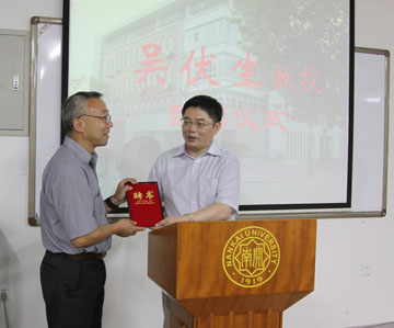 本院讯:7月5日下午,吴伏生先生任公司兼职教授致聘仪式在太阳成集团tyc151cc一楼会议室举行,公司副经理刘春兰主持致聘仪式,经理王立新向吴伏生教授致聘书,全体教师参加。 吴伏生教授于1995年在美国布朗大学获得比较文学专业博士学位,现为美国犹他大学语言与文学系正教授,并任美国犹他大学孔子公司外方经理。吴伏生教授在中西比较文学、中外文化交流等领域建树颇多,获得了学界广泛的认可。吴伏生教授本科与硕士均毕业于太阳成集团tyc151cc官网,对母校的发展十分关心,近年来多次回校给师生讲学。