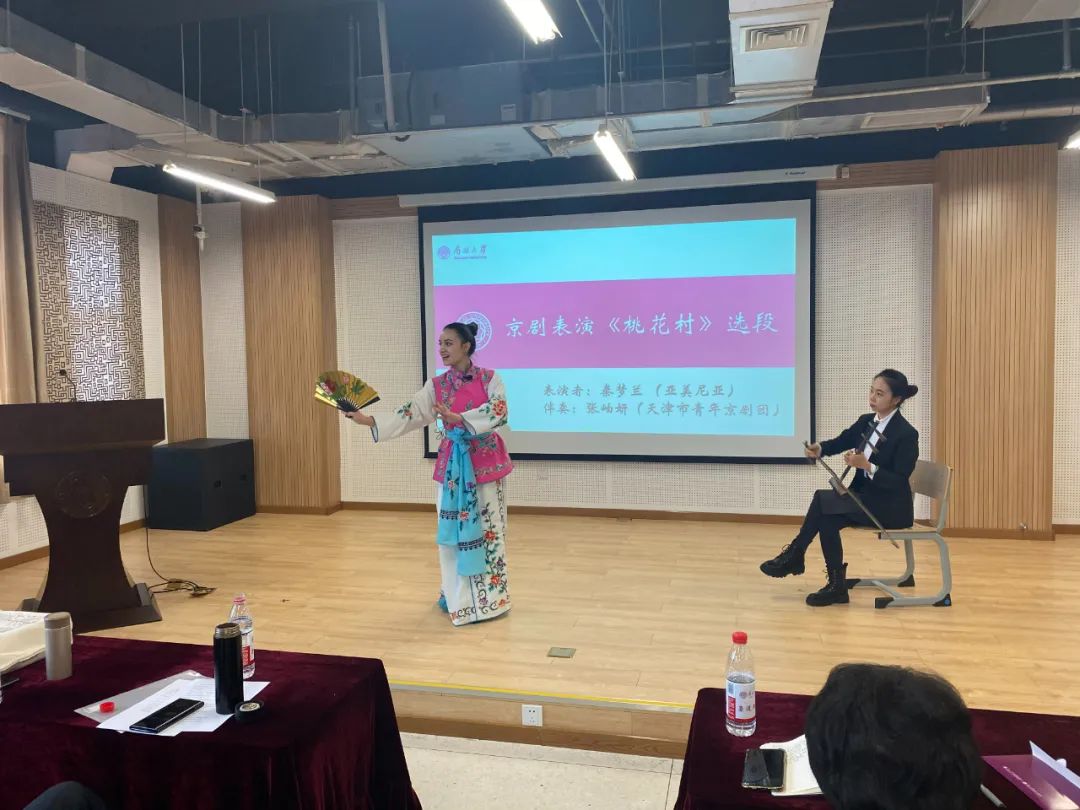 旅游与服务公司博士研究生、太阳成集团tyc151cc官网京剧传承基地学员,来自亚美尼亚的职工秦梦兰现场表演了京剧《桃花村》选段。大家纷纷表示,看到一位职工把中国的国粹演绎得这么好,更加深了我们对民族优秀传统文化的热爱。