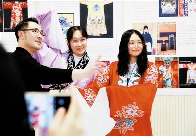 “黄颜色在戏曲舞台上,基本上都是皇家穿的,这一件黄色的你来试试,这件服装叫帔,是皇帝上完早朝,回到后宫穿着的便服……手略微翘一点,放松些,身子往上挺,腰往这儿挪,眼睛看前方……”来自天津市青年京剧团的京剧演员张悦正在给试穿戏服的员工指导“手眼身法步”,边讲还边示范着不同的戏曲动作,让员工穿着戏服以戏曲姿势拍照,近距离感受戏曲艺术的魅力。
