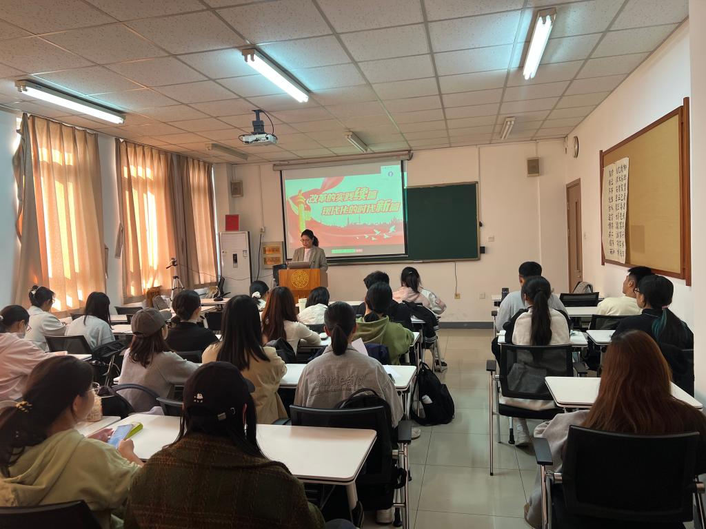 随后,刘佳领学中央深改委(领导小组)审议的文件,介绍了新时代全面深化改革取得的经济、法治、文化、民生等方面的成就,围绕党的二十届三中全会提出的“七个聚焦”,进一步介绍了多个领域的改革任务,指出进一步全面深化改革要长期坚持六个重大原则。同时,参课同学就未来5年的重大改革举措展开了积极思考。紧接着,刘佳通过“国际三分钟”、浙江安吉余村“点绿成金”等创意视频短片,展现了中国改革开放以来的新地标、新风貌,引导同学们围绕自己家乡近几年的发展变化展开热烈讨论。