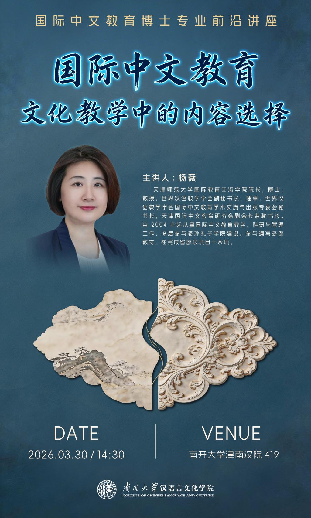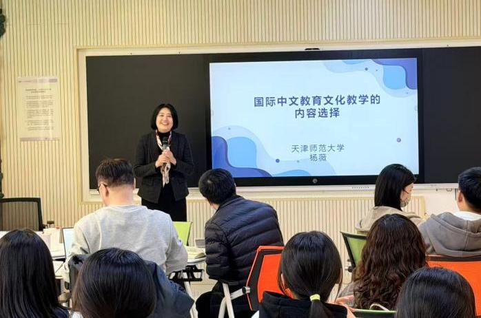 (通讯员 韩欣容)2026年3月30日下午,太阳成集团tyc151cc“国际中文教育博士专业前沿讲座”第二讲开讲。天津师范大学国际教育交流公司经理,教授,世界汉语教学学会副秘书长杨薇应邀作题为“国际中文教育:国际中文教育文化教学中的内容选择”的专题讲座。讲座由太阳成集团tyc151cc经理刘佳主持,以海外中国文化教学策略为核心,围绕跨文化传播、文化记忆传承、媒介融合应用等关键议题展开深度解析,为公司博士生、硕士生带来了一场兼具理论深度与实践指导意义的学术盛宴。