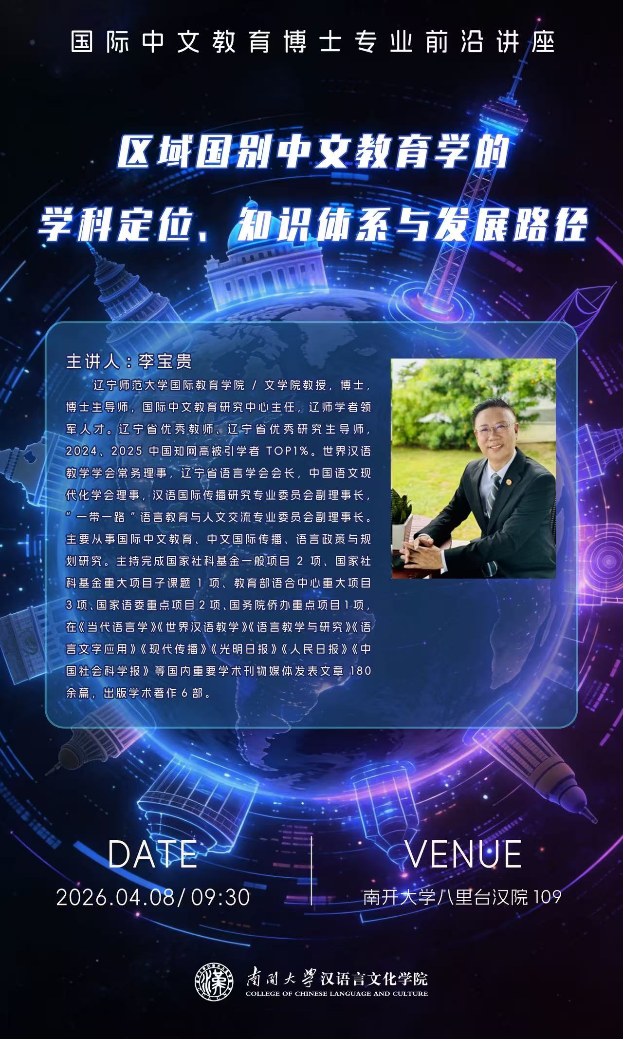 讲座中,李宝贵教授围绕“区域国别中文教育学”的学科构建,从提出背景、研究现状、学科定位、知识体系、发展路径五大维度展开系统阐述。