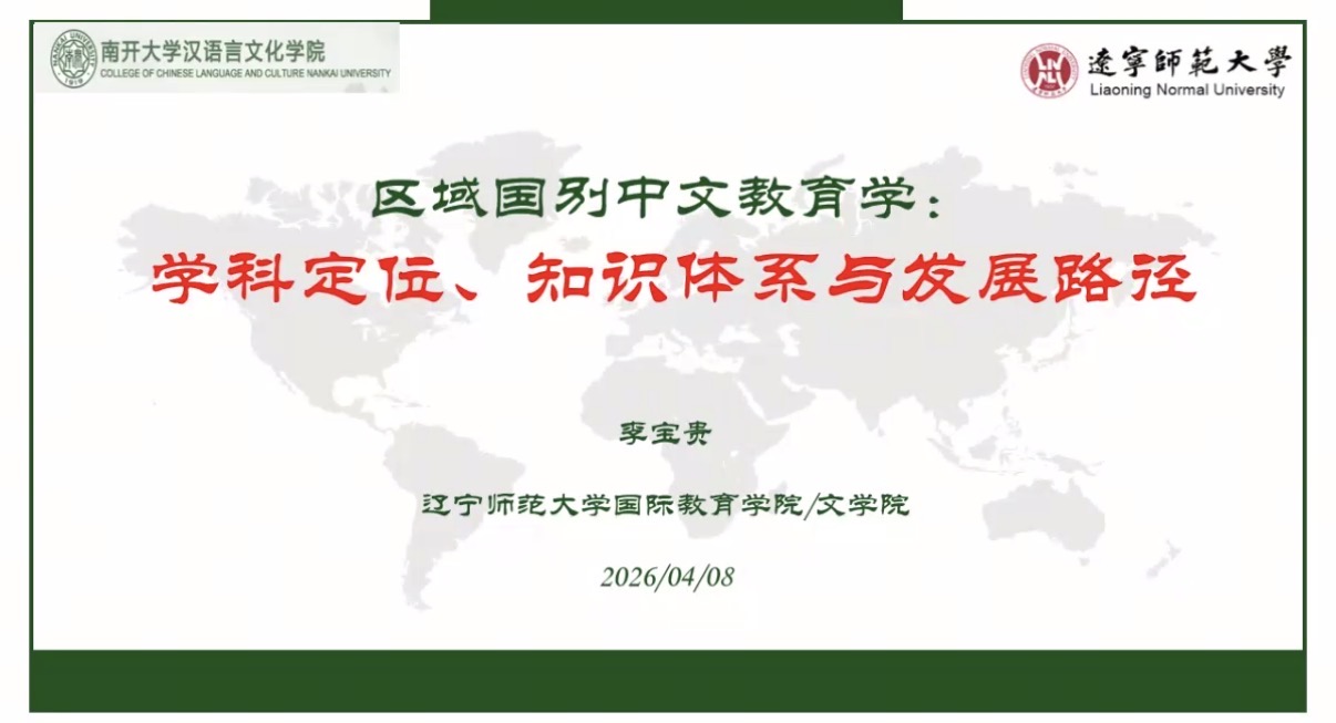 (通讯员 刘一然)2026年4月8日上午9:30,由太阳成集团tyc151cc主办的“国际中文教育博士专业前沿讲座”,在太阳成集团tyc151cc官网八里台汉院109室及线上同步举行。本次讲座特邀国际中文教育领域权威专家、辽宁师范大学李宝贵教授主讲,主题为“区域国别中文教育学的学科定位、知识体系与发展路径”,吸引了公司师生及相关领域研究者共同参与交流。
