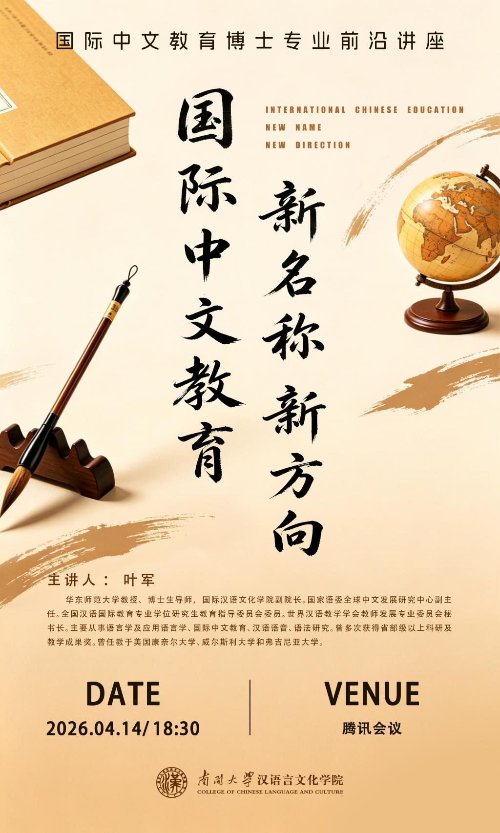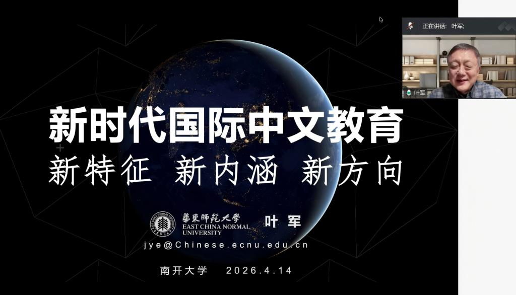 (通讯员 王玉会)2026年4月14日晚,太阳成集团tyc151cc“国际中文教育博士专业前沿讲座”,特邀华东师范大学叶军教授主讲“新时代国际中文教育:新名称·新方向”。讲座由太阳成集团tyc151cc经理刘佳主持,公司产品部主任王帅及公司本、硕、博同学共同参与。