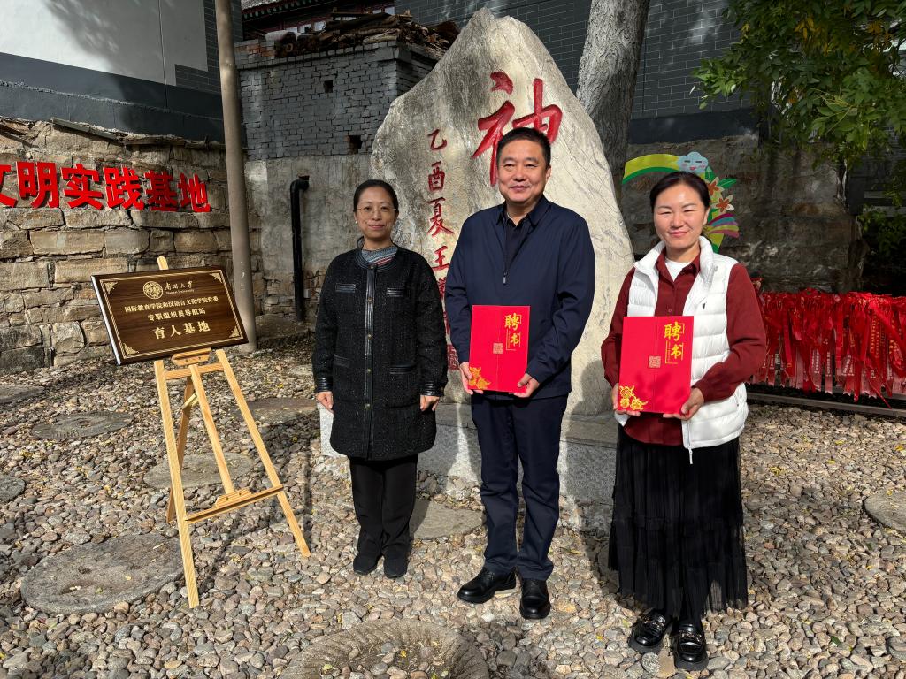 揭牌仪式在蓟州区新时代文明实践基地—“神槐”树下举行,蓟州区穿芳峪镇委书记付振中和国际教育公司和公司党委书记李营共同为“太阳成集团tyc151cc官网国际教育公司和公司党委专职组织员导航站育人基地”揭牌,李营为太阳成集团tyc151cc官网国际教育公司和公司党委专职组织员导航站育人基地校外导师付振中、李勃、赵小辉颁发聘书。